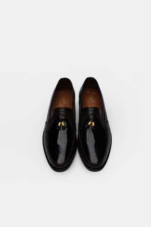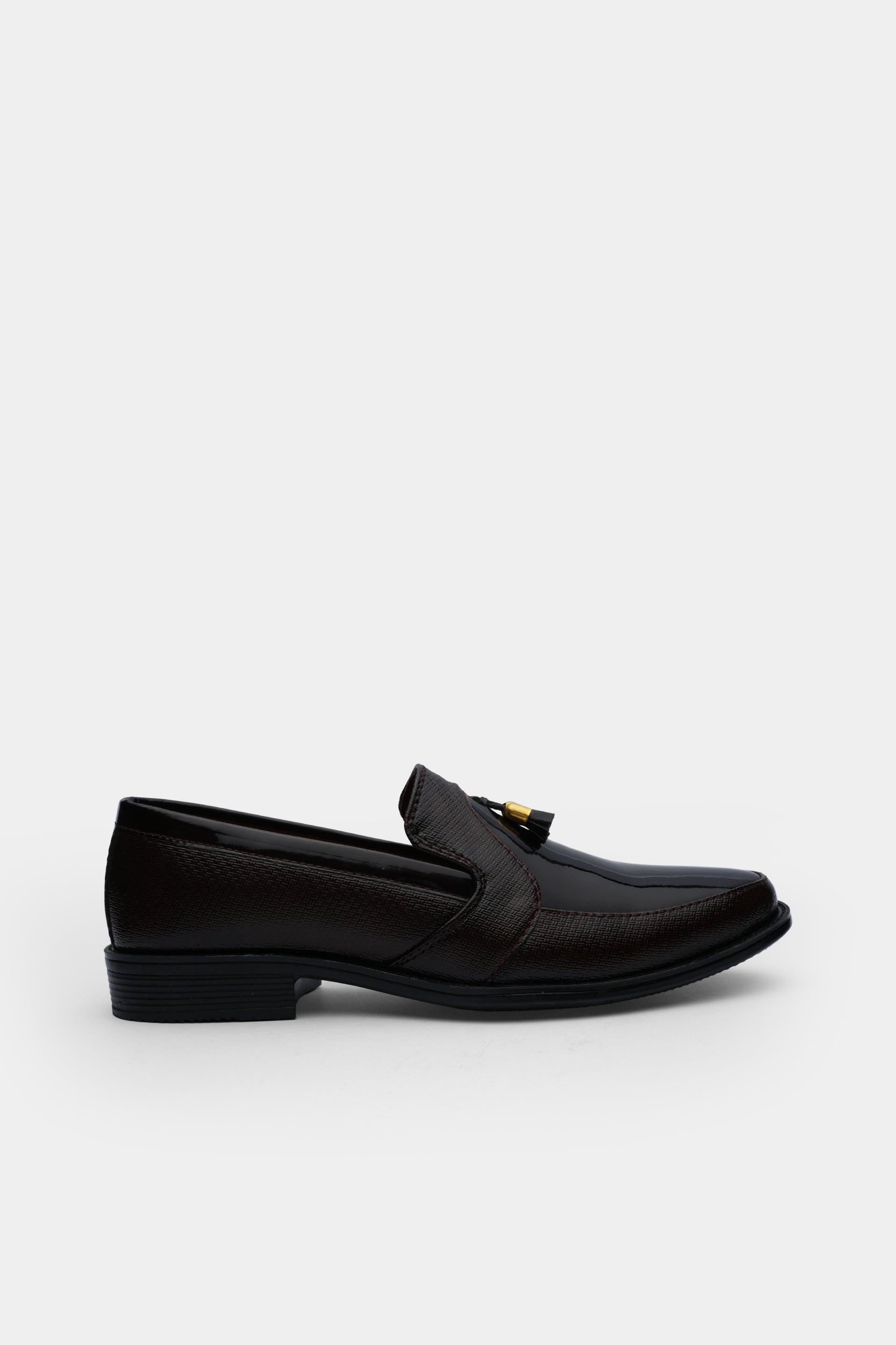 - Step into timeless refinement with these glossy dark brown loafers, featuring textured side panels and gold-accented tassels. Designed for formal finesse and all-day comfort.