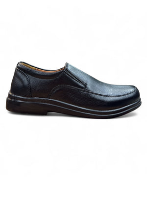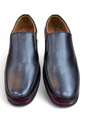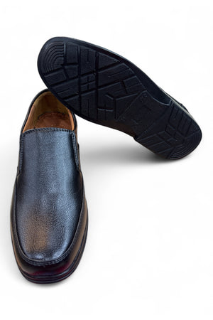 A sleek embodiment of minimalist luxury, the Midnight Crest loafers feature a high-gloss black leather upper with subtle edge stitching that frames the silhouette like tailored lapels. The rounded toe and slightly elevated dark brown sole add depth and contrast, while the tan interior lining hints at heritage craftsmanship beneath the surface.